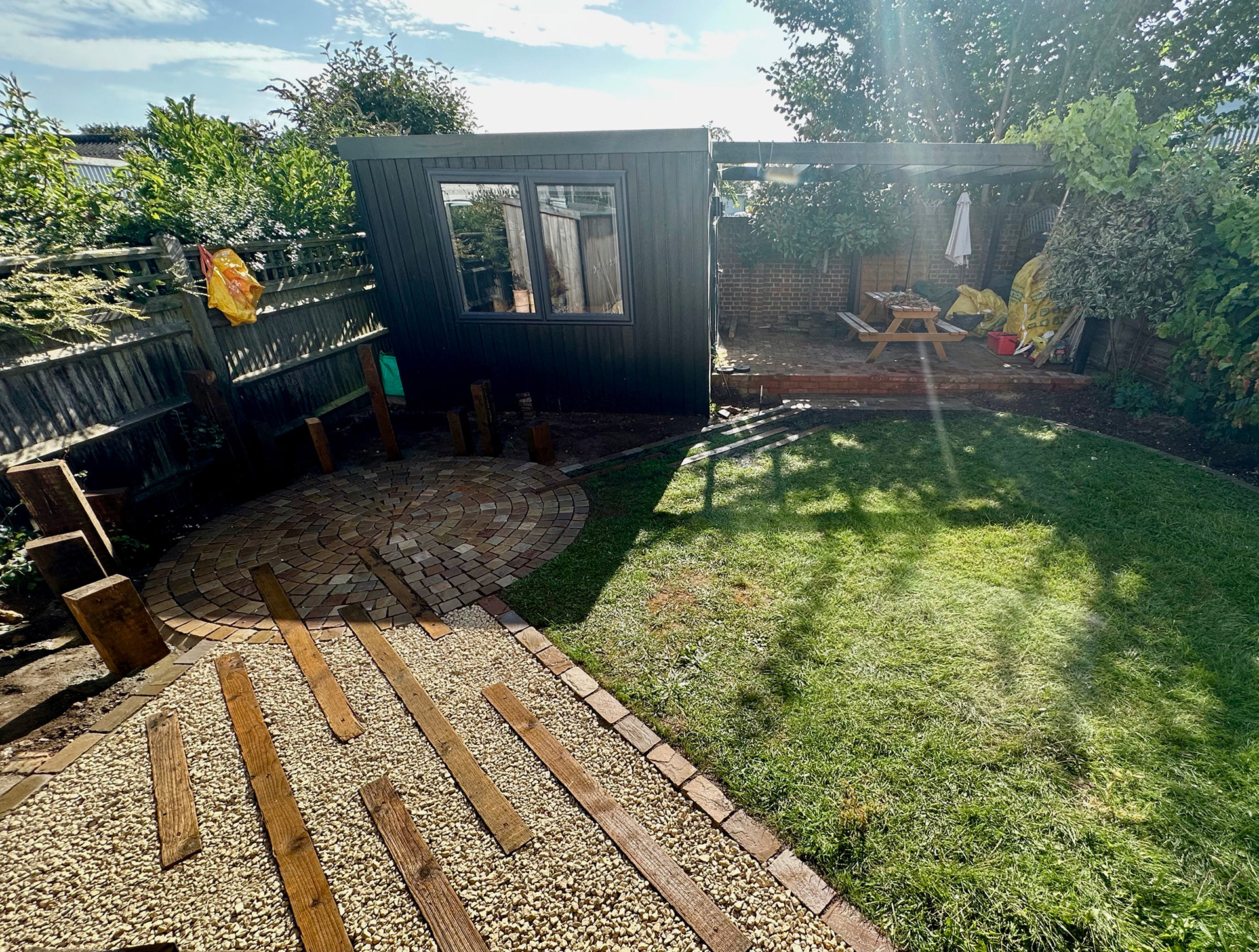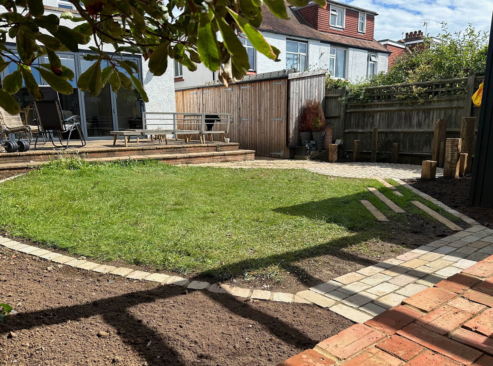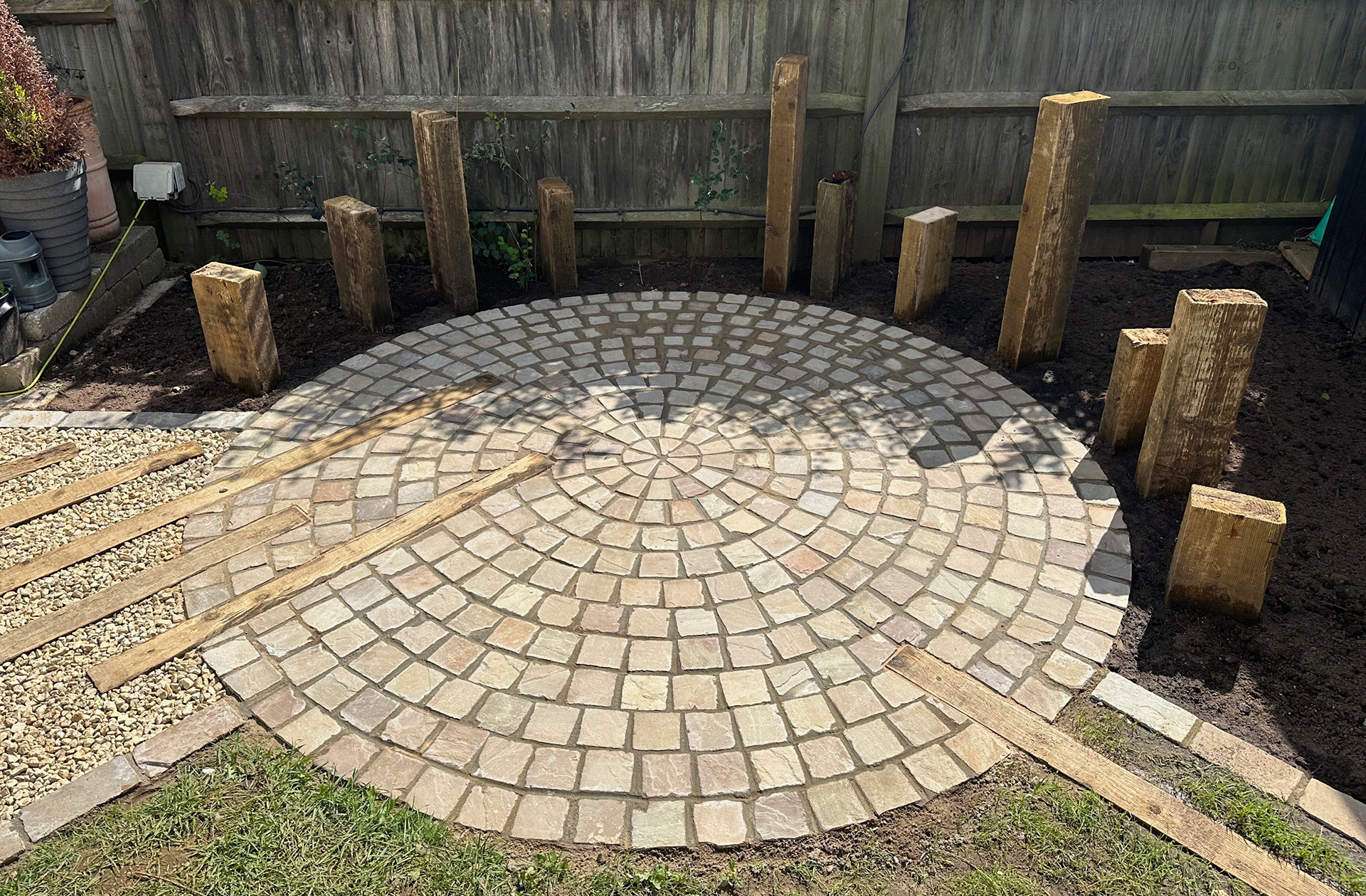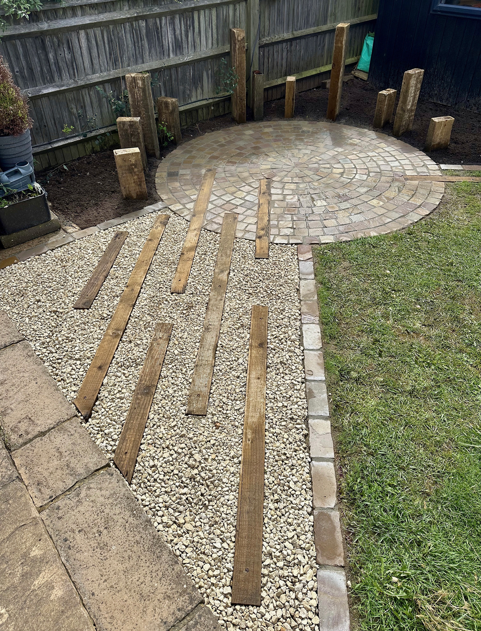 Raj Green Sandstone Setts Paving, Inlaid sleepers for pathways and plant screening.