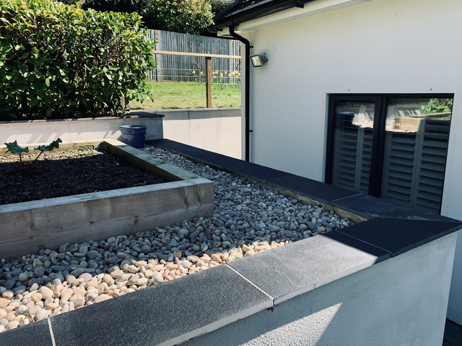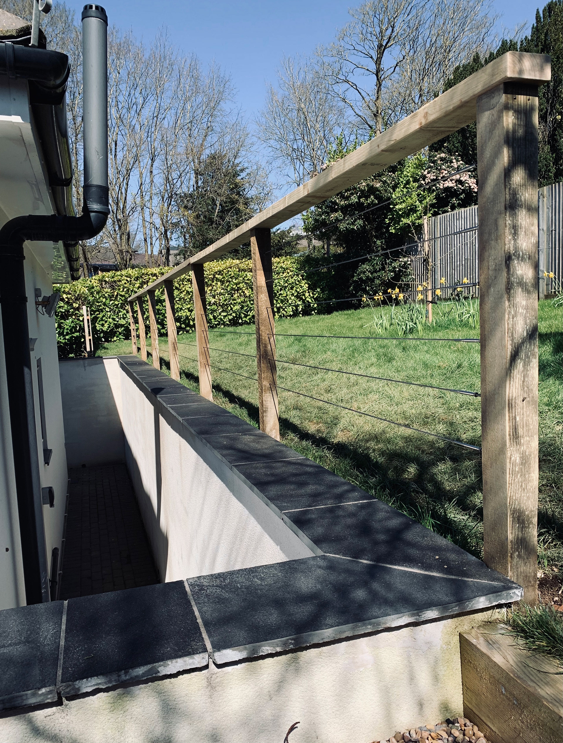 Granite coping stones, sleeper steps & timber and stainless steel balustrade.
