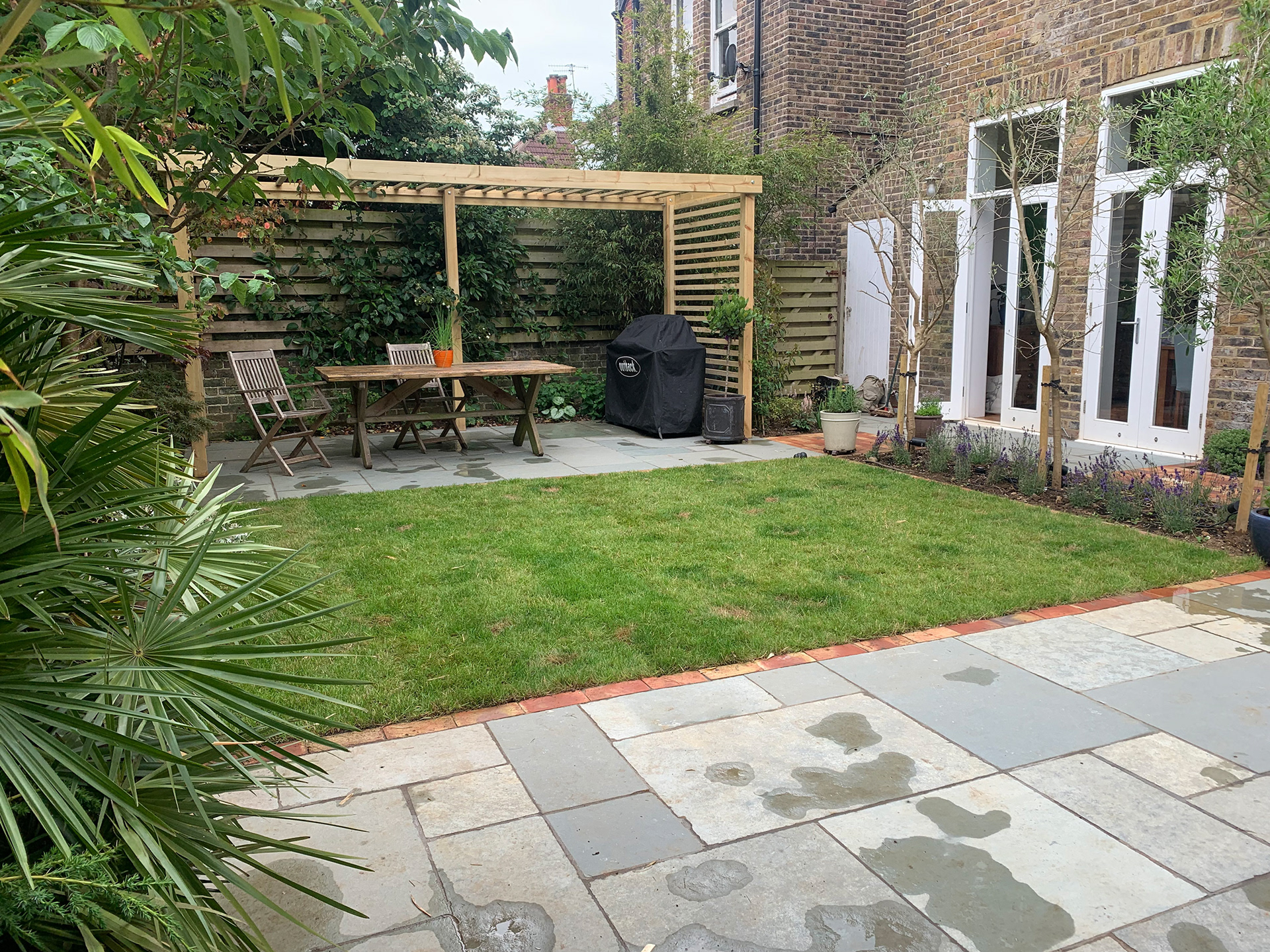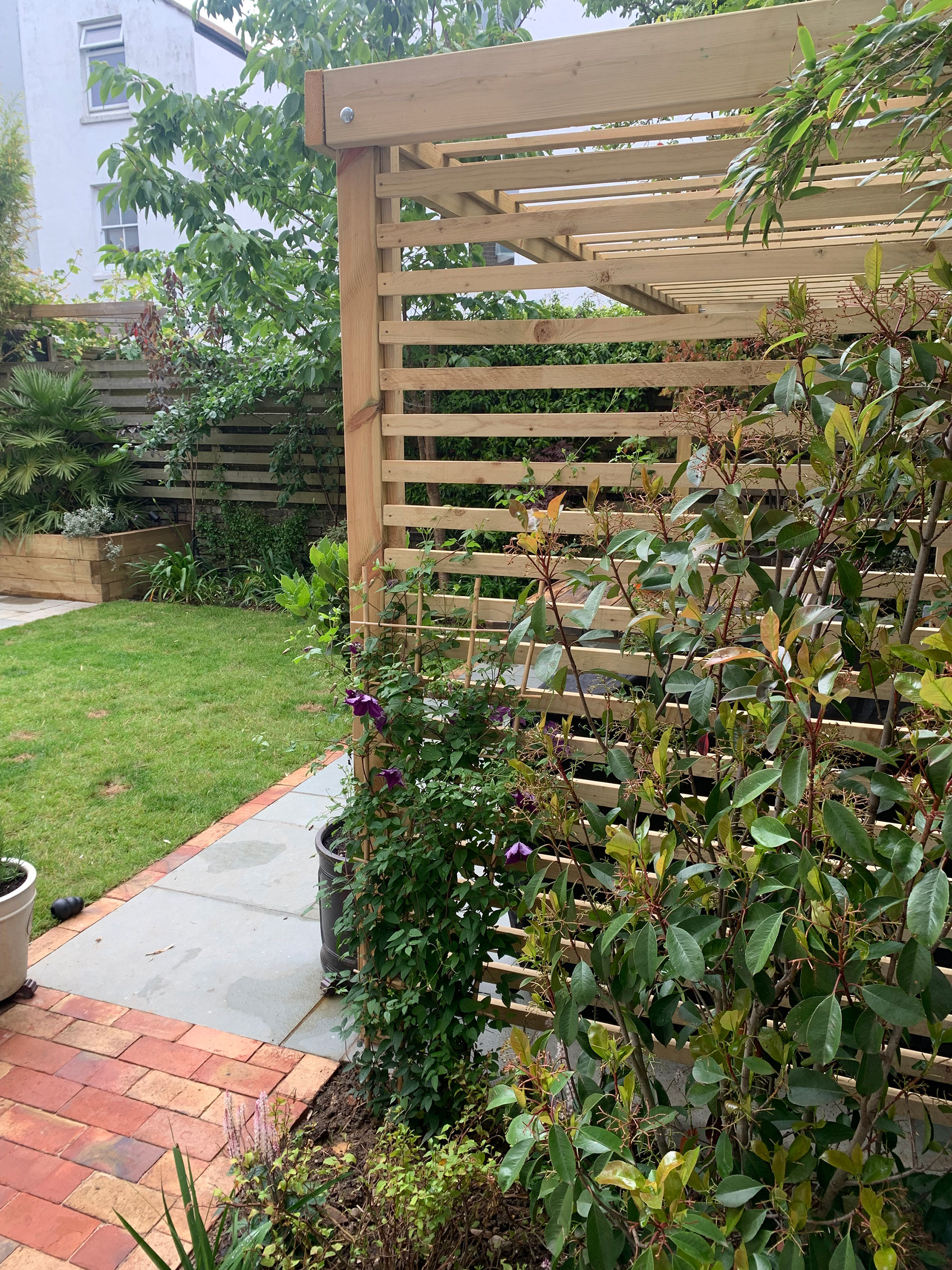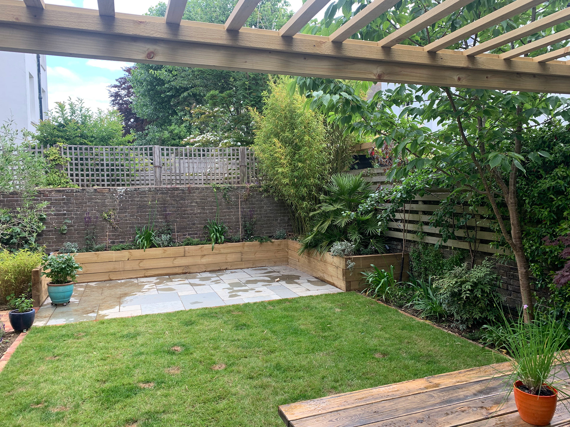 Brick Pathways, Sandstone Paving, Pergola, Raised Sleeper Beds. & Planting.